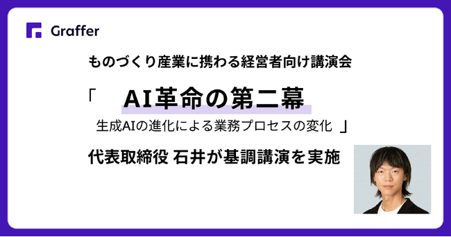 生成AI活用による企業変革を実現する株式会社グラファー(本社:東京都渋谷区、代表取締役:石井大地、以下「当社」)は、一般社団法人ものづくりなでしこ(東京都台東区、代表理事:渡邊 弘子、以下「ものづくりなでしこ」)が主催する講演会にて、当社代表取締役の石井が基調講演を行いました。本講演では「AI革命の第二幕 もっと欲望を語り合おう」をテーマに、生成AIの進化による業務プロセスの変化とその最新事例を解説しました。また、AIを活用する企業にとって必要不可欠となるAIマネジメントスキルの重要性と習得方法にも言及しました。