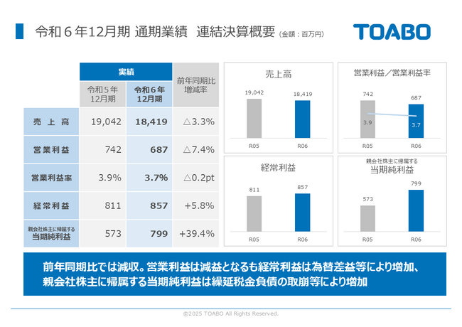 株式会社トーア紡コーポレーション(本社:大阪府大阪市、代表取締役社長:長井渡、東証スタンダード:3204)は、2025年2月13日、令和6年12月期の決算を発表いたしました。