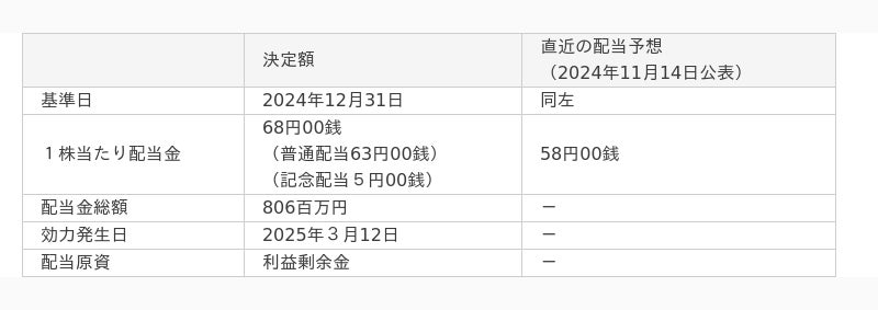 この基本方針に基づき、2024年12月期の期末配当金は、1株当たり63円00銭の普通配当を実施することといたしました。また、当社は2024年10月16日に東京証券取引所スタンダード市場へ上場いたしました。この節目を記念し、株主の皆さまへの感謝の意を表するため、1株当たり5円00銭の記念配当を実施することといたしました。これにより、2024年12月期の期末配当は、1株当たり68円00銭となります。