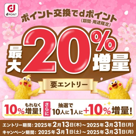 本キャンペーンの参加にはエントリーが必要で、エントリーは2025年2月13日(木)から受付開始いたします。キャンペーン期間中、対象のポイント交換企業のポイントをdポイントへ交換することで受け取るポイントが通常時より、もれなく10%増量※2※3、さらに抽選で 10人に1人の確率で通常時より 10%増量※2※3※4され、合計して最大 20%分のdポイント(期間・用途限定)を進呈いたします※5。抽選の10%増量分の進呈上限は1アカウントあたり10万ポイントです。なお、もれなく増量される10%増量分には進呈上限はございません。