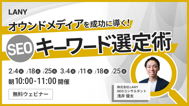 デジタルマーケティング支援を行う株式会社LANY(東京都渋谷区、代表取締役社長:竹内渓太)は、【無料ウェビナー】オウンドメディアを成功に導く!SEOキーワード選定術を3/25(火)まで複数日程開催いたします。