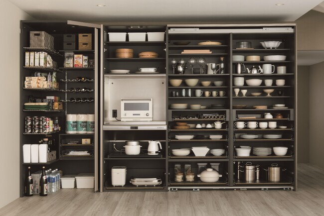 壁面全体を使った大型収納。よく使うものをサッと取り出せる大型扉中段にある昇降式窓(アクセスウィンドウ)(写真左)と、扉全体を開けて上から下まで見渡せるスライドドア(写真右)の2通りの使い方ができます。