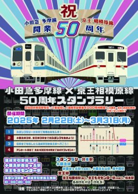 京王電鉄株式会社(本社:東京都多摩市 社長:都村 智史)と小田急電鉄株式会社(本社:東京都 新宿区 社長:鈴木 滋)は、2月22日(土)から3月31日(月)まで「小田急多摩線×京王相模原線 50周年スタンプラリー」を実施します。これは、相模原線の京王よみうりランド駅から京王多摩センター駅までの開通と多摩線の開業からそれぞれ50周年を記念し、改めて両沿線をお楽しみいただきたいという思いから企画したイベントです。
