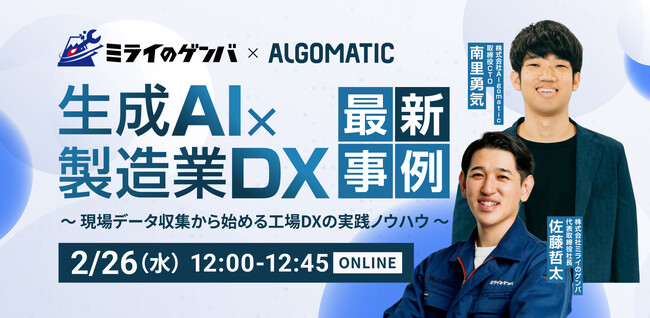 製造現場に特化した、AI現場帳票システム「ミライのゲンバ帳票」を提供する株式会社ミライのゲンバ(本社:東京都港区、代表取締役社長:佐藤 哲太 以下、ミライのゲンバ)は、株式会Algomatic(本社:東京都港区、代表取締役:大野 峻典、以下 Algomatic)と共催で無料ウェビナー「生成AI × 製造業DXの最新事例」~現場データ収集から始める工場DXの実践ノウハウ~を2025年2月26日(水)に開催いたします。