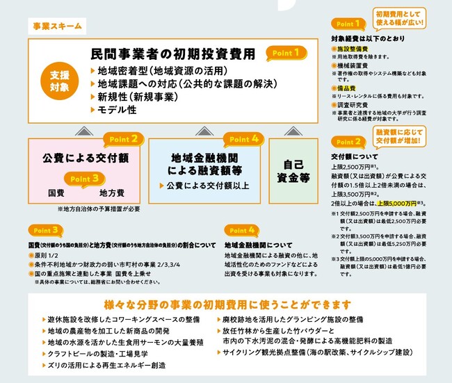 本プロジェクトでは、 最大5,000万円の補助金 を活用し、民間事業者の 初期投資費用(施設整備・改修費、備品費など) を支援します。