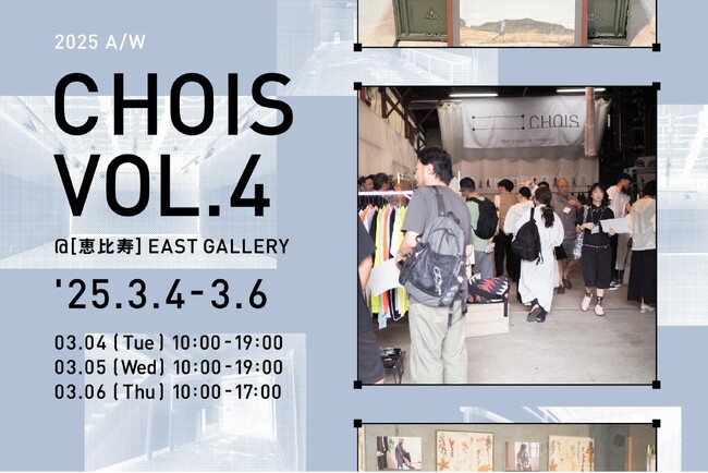ファッション・雑貨・ライフスタイルを軸とし、独自の“カラー”を持ったブランドが集う合同展示会「CHOIS(チョイス) vol.4 2025年秋冬展」を、2025年3月4日(火)から6日(木)の3日間、恵比寿EAST GALLERYにて開催いたします。