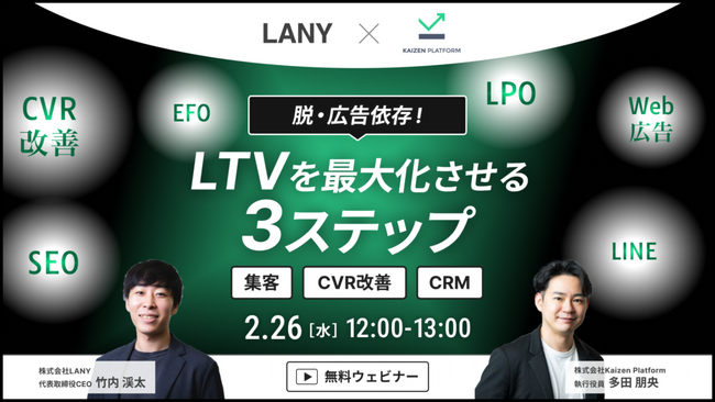 デジタルマーケティング支援を行う株式会社LANY(東京都渋谷区、代表取締役社長:竹内渓太)は、株式会社Kaizen Platformと共催にて、【無料共催ウェビナー】脱・広告依存!LTVを最大化させる3ステップを2/26(水)に開催いたします。