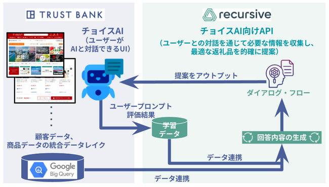 トラストバンクの地域ネットワーク等のアセットとRecursiveの先進的なAI技術を生かし、地域活性化を推進。初期段階としてふるさと納税事業において返礼品を推奨するコンシェルジュ型AI機能の開発に着手