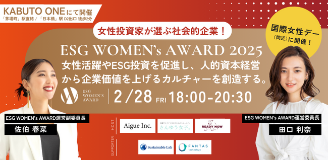 エグ株式会社(本社:東京都渋谷区、代表取締役:田口利奈)は、株式会社きんゆう女子(本社:東京都中央区、代表取締役:佐伯春菜)および株式会社READY NOW(本社:東京都千代田区、代表取締役:佐伯春菜)の3社共同で、ESG WOMEN's AWARD運営委員会を発足し、2月28日(金)KABUTO ONEにて「ESG WOMEN's AWARD 2025」を開催することをお知らせいたします。
