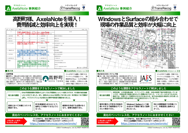 Windows用PDF書き込みソフトAxelaNote(アクセラノート)を提供する株式会社TransRecog(本社:東京都港区)は、AxelaNoteの導入事例を新たに2件、高野町様及び株式会社日消システムズ様分を公開致しました。これにより導入事例の公開は累計8件となり、さまざまなシーンでご活用頂けるAxelaNoteの具体的な事例をユーザー様の声と共にお届けすることになります。