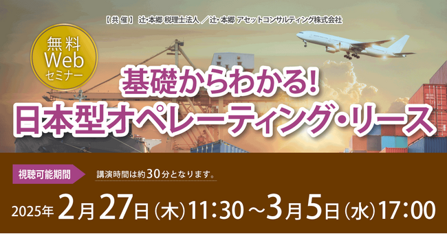 辻・本郷 税理士法人(本社:東京都新宿区、理事長:桑木小恵子)は、辻・本郷 アセットコンサルティング株式会社(本社:東京都新宿区、代表取締役:吉川僚)と共催で、2025年2月27日(木)より「基礎からわかる! 日本型オペレーティング・リース」セミナーを開催いたします。航空機や船舶、海上輸送用コンテナを対象とした日本型オペレーティング・リースへの投資は、利益の繰り延べ効果など、そのユニークな特長から年々市場規模を拡大し、2025年には5,000億円を超えると予想されています。本セミナーでは、日本型オペレーティング・リースの仕組みから具体的な投資効果、活用のヒントやリスクまで、業界最大手の組成責任者の講師にわかりやすく解説していただきます。
