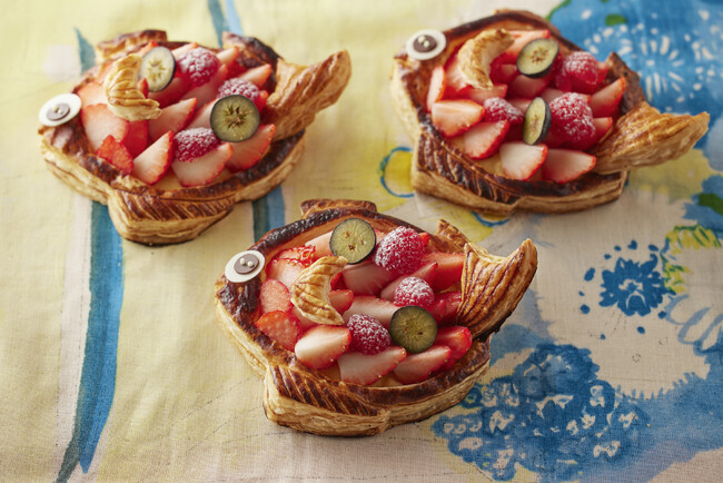 グランドニッコー東京 台場の「ポワソンダブリル」は、魚の形に焼き上げたバターの豊かな香りが広がるパイ生地に、なめらかなカスタードクリームを絞り、3種のベリーをぎっしりと飾りました。カスタードクリームの濃厚な甘さと甘酸っぱいフレッシュなベリーのハーモニーに加え、生地のサクサクとした食感もお楽しみいただける贅沢なスイーツです。