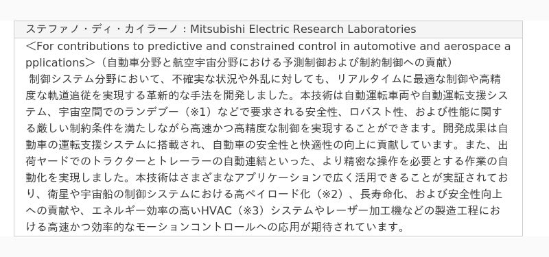 三菱電機株式会社は、米国の現地法人であるMitsubishi Electric Research Laboratories(米国マサチューセッツ州)の研究員のStefano Di Cairano(ステファノ・ディ・カイラーノ)が、Institute of Electrical and Electronics Engineers(以下、IEEE)から「IEEEフェロー」への昇格を認定されましたのでお知らせします。