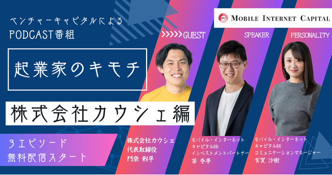 モバイル・インターネットキャピタル株式会社(代表取締役:元木新、本社:東京都千代田区、以下MIC)は、弊社が運営するPodcast番組「スナック起業家のキモチ」において、「誰かと一緒に」を楽しむお買い物アプリ「カウシェ」を運営する株式会社カウシェ(本社:東京都渋谷区、代表取締役:門奈剣平、以下カウシェ)の門奈氏をゲストに迎え、新エピソードの配信をスタートしましたのでお知らせいたします。