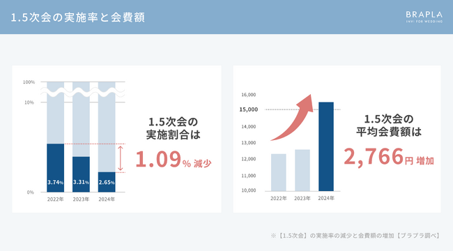 かつて「会費制にすることで結婚式全体の費用を抑えられる」として支持されていた1.5次会。しかし、2022年以降、その実施割合は減少し続けている一方、1.5次会の会費額は上昇傾向にあることがわかりました。