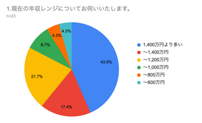 調査結果によると、最も多い年収レンジは「1,400万円より多い」の層で、全体の43.5%を占めました。次いで、「1,000万円~1,200万円」が21.7%、「1,200万円~1,400万円」が17.4%、年収1,000万円以上が82.6%と、高収入層が圧倒的多数という結果になりました。一方、1,000万円未満の層は17.4%にとどまり、卒業生は比較的高い年収帯に属していることが明らかになりました。