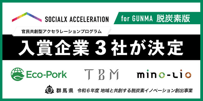 株式会社ソーシャル・エックス(本社:東京都渋谷区、以下、当社)は、群馬県「令和6年度 地域と共創する脱炭素イノベーション創出事業」事務局として、官民共創型アクセラレーションプログラム「ソーシャルXアクセラレーションfor GUNMA」の最終審査会を群馬県庁32階官民共創スペースNETSUGENにて実施し、最優秀賞に株式会社Eco-Pork、優秀賞に株式会社TBM、審査員特別賞に株式会社mino-lioの3社が選ばれました。