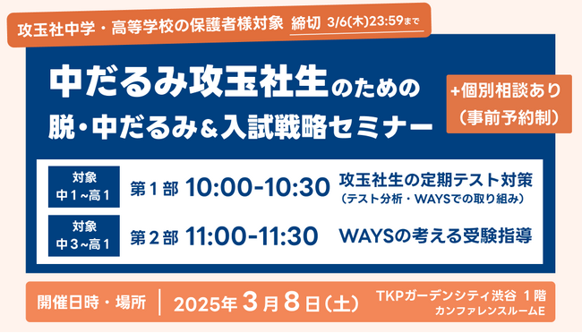 株式会社メイツ(本社:東京都新宿区 代表取締役:遠藤尚範)が運営する『中高一貫校専門 個別指導塾WAYS(以下、WAYS)』は、この度、攻玉社中学・高等学校に通う生徒の保護者様を対象に、脱・中だるみと大学入試に向けたおすすめの対策法を、WAYSでの取り組みも踏まえてご紹介するセミナーを開催いたします!