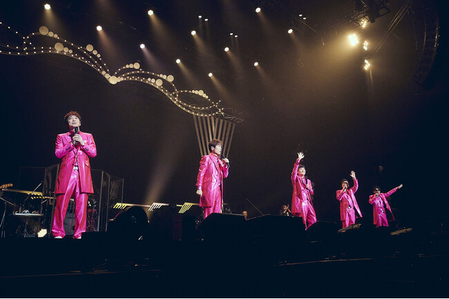 定刻を迎えて場内が暗転すると、スモークが立ち上るステージに5人のシルエットが現われる。中央に立つリーダー村上てつやの歌い出しで、代表曲「ひとり」をアカペラで披露する。エモーショナルな歌声と真骨頂とも言えるファルセットに4人のコーラスが寄り添う。一転して、グルーヴィなサウンドの「靴は履いたまま」「一筋の軌跡」へ。それぞれがフレーズを歌い分けることで、より多面的な表情を魅せるゴスペラーズの音楽の扉が開かれる。ハンドマイクを手に踊る彼らは、お揃いのピンクのスーツ姿。銀色のテープや鮮やかなレーザービームがステージに彩りを加えていく。