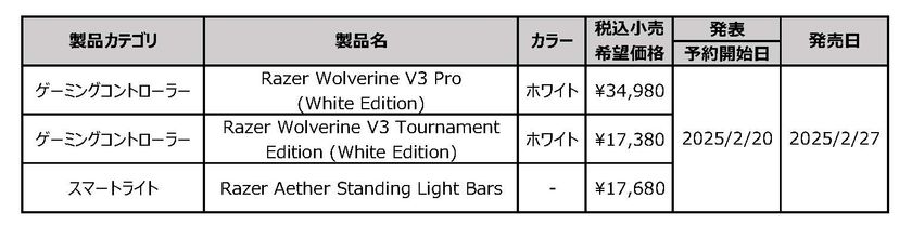 ゲーマー向けライフスタイルブランドとして世界をリードするRazer(TM)(本社:米国カリフォルニア州およびシンガポール、共同創業者兼CEO:Min-Liang Tan)は、Xbox向けプレミアムコントローラーの最新モデルである「Razer Wolverine V3 シリーズ」に、新色ホワイトを採用した「Razer Wolverine V3 Pro (White Edition)」「Razer Wolverine V3 Tournament Edition (White Edition)」と「Razer Aether Standing Light Bars」の計3製品を発表いたします。本製品は、全国の家電量販店、PCショップ、オンラインショップなど国内正規流通代理店 MSY株式会社を通じて、2025年2月20日(木)より予約開始いたします。販売開始は2025年2月27日(木)を予定しています。