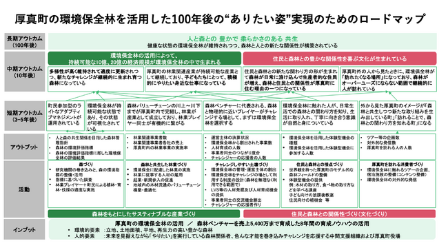 この「ロードマップ」は、厚真町内の約280ヘクタール(東京ドーム約60個分)の環境保全林を活用して、100年後に「人と森との豊かで柔らかさのある共生」を実現するという目標からバックキャスティングし、10年後、3~5年後と目標を細分化して現在必要な活動まで落とし込み、ロジックモデルとして整理したものです。厚真町がローカルベンチャー育成等を通じて今後、森林活用を軸とした新たな産業群の創出を目指すなかで、関係者の現在地把握の羅針盤として、またステークホルダー間の共通言語として機能することを企図し、ローカルベンチャー協議会が参画自治体支援の一貫として作成しました。