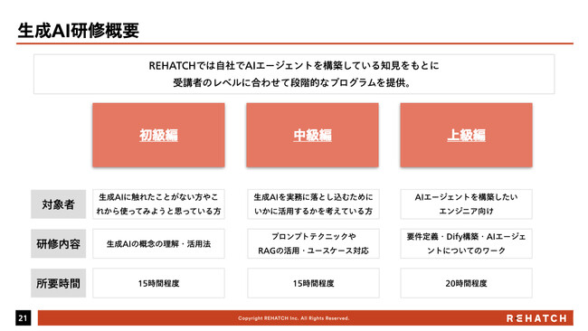 REHATCH株式会社(本社:東京都千代田区、CEO:迫田 亮太、以下「REHATCH」)は、 実務型AI研修サービスで競争力強化を目的とした人材紹介業界に特化したAI活用研修「AI人材革命研修」を新たにリリースしました。