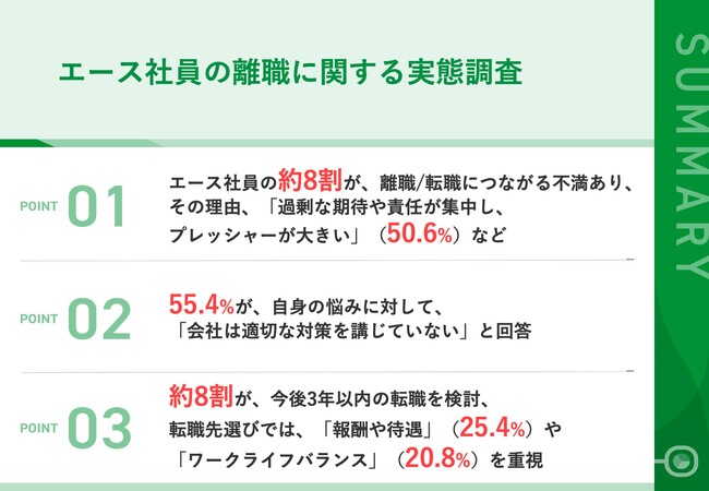 - 01|エース社員の約8割が、離職/転職につながる不満あり、その理由、「過剰な期待や責任が集中し、プレッシャーが大きい」(50.6%)など