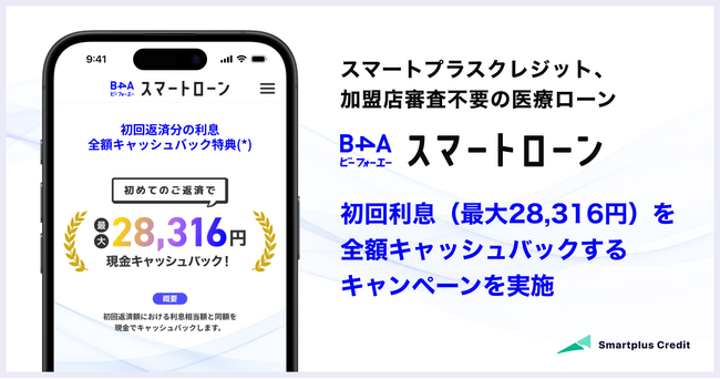 スマートプラスクレジット、加盟店審査不要の医療ローン「B4Aスマートローン」にて初回利息(最大28,316円)を全額キャッシュバックするキャンペーンを実施