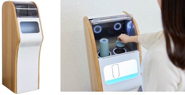 ※写真左から、マイボトル洗浄機(万博モデル)、マイボトルをセットする様子のイメージ