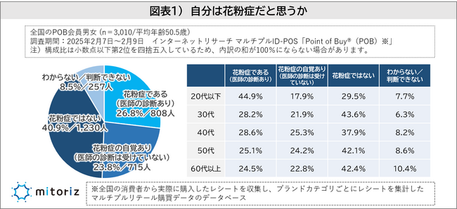 株式会社mitoriz(本社:東京都港区、代表取締役社長:木名瀬博)は、消費者購買行動データサービス「Point of Buy(R)(以下、POB)」の会員3,010人に「花粉症に関する調査」を実施しました。