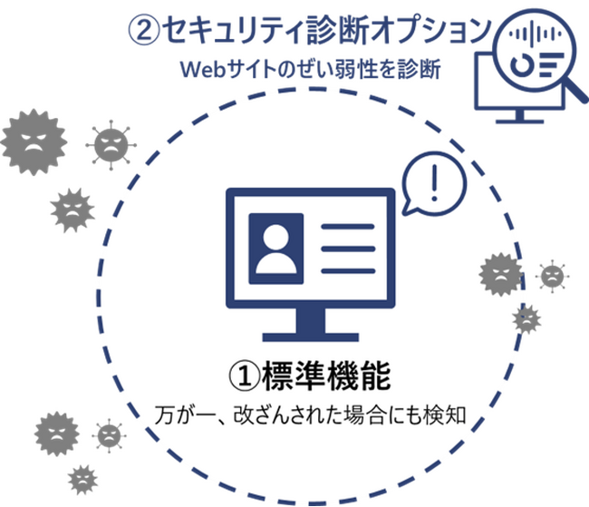 今回、Webサイトのぜい弱性を事前に診断する機能をオプションとして追加します。Webサイトのぜい弱性を日々確認できることで、早期に対策ができるため、Webサイトの改ざんを未然に防ぐことが可能となります。