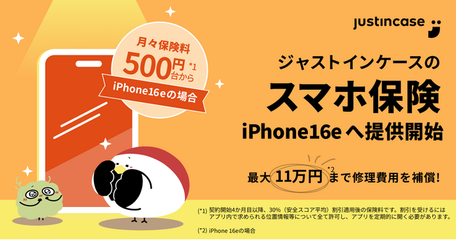 株式会社justInCase(以下、「当社」)は、 iPhone 16e の発売日(日本時間2025年2月28日)当日より、スマホの破損や盗難・紛失を補償する「スマホ保険」(正式名称:モノ修理費用保険)を提供いたします。