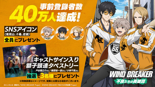 株式会社講談社(本社:東京都文京区、代表取締役社長:野間省伸)は、TVアニメ『WIND BREAKER』(略称、『ウィンブレ』)を題材とした完全新作オンラインゲーム『WIND BREAKER 不良たちの英雄譚』(略称、『ウィンヒロ』)の事前登録者数が40万人を達成したことをお知らせいたします。
