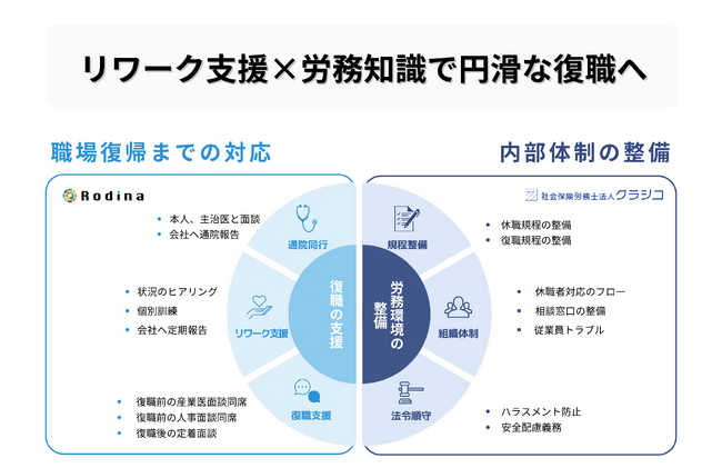 人事労務の専門家である社会保険労務士法人クラシコと、リワーク支援事業を行う株式会社Rodinaの協業で、メンタルヘルスの課題を持つ従業員と、課題解決に取り組む人事担当者への支援の充実を目指します。