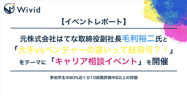 ハイクラス学生をメインターゲットとして就活支援を行う株式会社ウィビッド(本社:東京都渋谷区 代表取締役:大槻修也、以下ウィビッド)は、2026年卒業(以下26卒)就職活動生(以下就活生)向けにキャリア相談イベントを開催しました。イベントには、株式会社はてなで副社長なども務められた毛利裕二氏をゲストに迎えて実施いたしました。