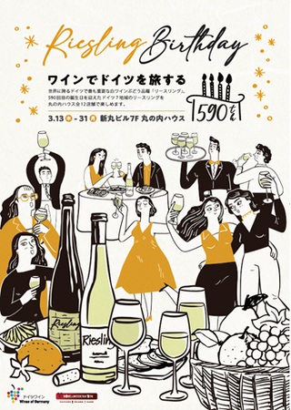 Wines of Germany 日本オフィスは、590回目のリースリング・バースデーを機に、世界に誇るドイツで最も重要な白ワインぶどう品種「リースリング」の魅力を多くの方に知っていただくため、2025年3月13日(木)~3月31日(月)まで、「リースリング・バースデーフェア~ワインでドイツを旅する~」を丸の内ハウス内の全12店舗のレストランにて開催します。フェア期間中は、ドイツの様々な地域のリースリングのワインをバイザグラスでお楽しみいただき、皆さまをドイツのぶどう畑への旅へ誘います。