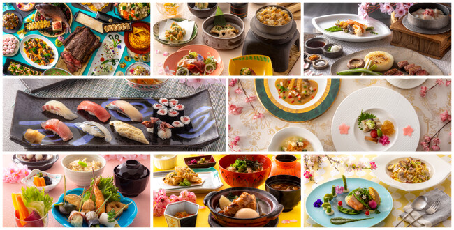 各レストランのシェフが創意工夫を凝らし、ランチは「春の花」をテーマにした見た目も華やかなメニューを、ディナーは、春ならではの食材の桜鯛や桜海老、山菜・木の芽などを使用し、“芽吹きの春”を感じるメニューをご用意。