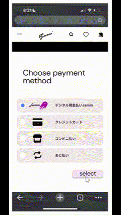 ユーザーはオンラインの支払いページにて以下のように「デジタル現金払い!Jamm」を選択すれば銀行口座からの決済が完了します。
