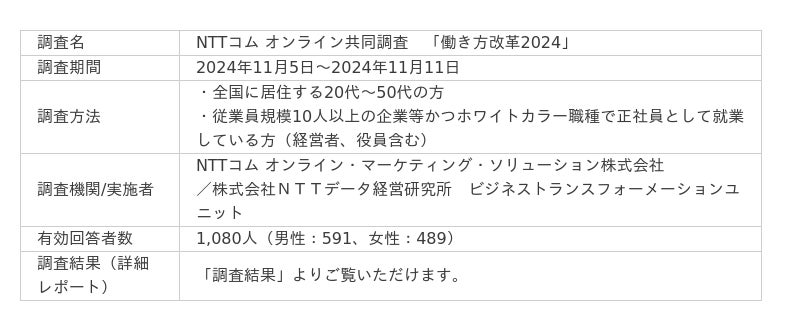 NTTコム オンライン・マーケティング・ソリューション株式会社(本社:東京都品川区、代表取締役社長:塚本良江、以下NTTコム オンライン)は、株式会社NTTデータ経営研究所(本社:東京都千代田区、代表取締役社長:山口 重樹、NTTデータ経営研究所)と共同で、NTTコム リサーチ登録モニターおよび協力企業を対象に「働き方改革2024」に関する調査(以下、本調査)を実施しました。