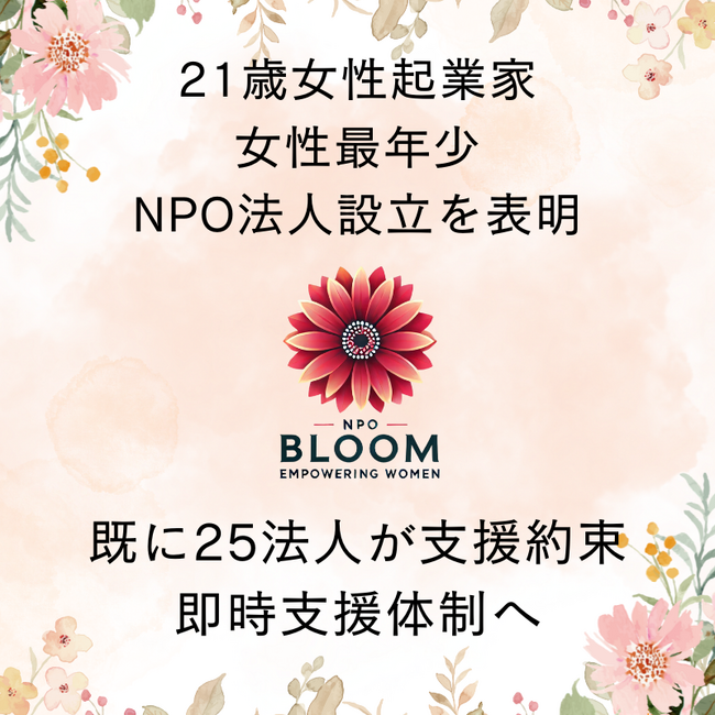 ジェンダー格差、女性の経済的自立、社会復帰支援、環境問題。これらの課題に正面から向き合い、解決に向けて即時支援を提供する新しい形のNPO法人が誕生します。NPO法人BLOOMは設立表明時にも関わらず、すでに25社以上が支援を表明。さらにボランティア団体との連携により即時支援が可能な体制を整えています。女性の生き方に新たな選択肢を生み出すこの取り組みに注目が集まっています。※2025年3月1日現在、自社調べによる国内女性最年少NPO代表理事となります。