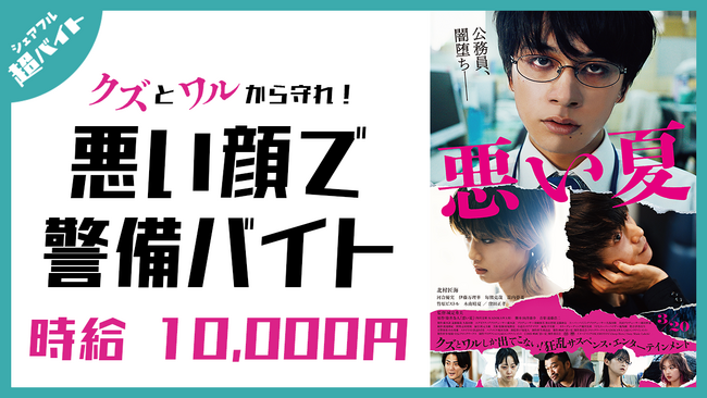 今回の超バイト企画では、2025年3月22日(土)に行われる、映画『悪い夏』の舞台挨拶にて、悪い顔で舞台挨拶を見ながら来場者をアテンドし警備する超バイトを募集します。