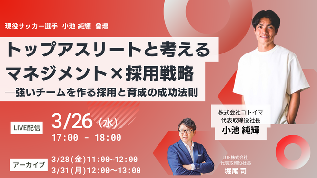 LUF株式会社(本社:東京都港区、代表取締役社長:堀尾 司)は、3月26日(水)開催のセミナー「トップアスリートと考えるマネジメント×採用戦略─強いチームを作る採用と育成の成功法則」に登壇いたします。
