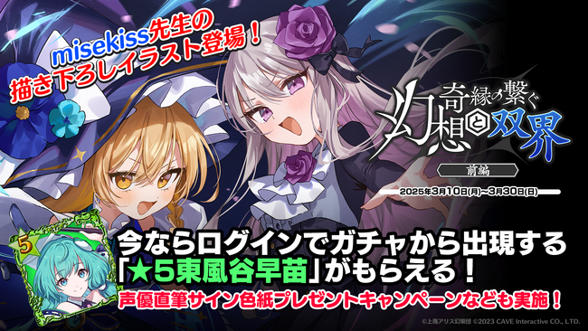 前編、後編の2部構成でオリジナル二次創作ストーリーをお楽しみいただけるコラボ記念イベントや、misekiss先生の描き下ろしイラストを含むコラボ使い魔が獲得できるガチャの他、コラボ使い魔★5「東風谷早苗」がもらえるログインボーナスや出演声優のサイン色紙が当たるXキャンペーンなども実施中ですので、あわせてお知らせいたします。