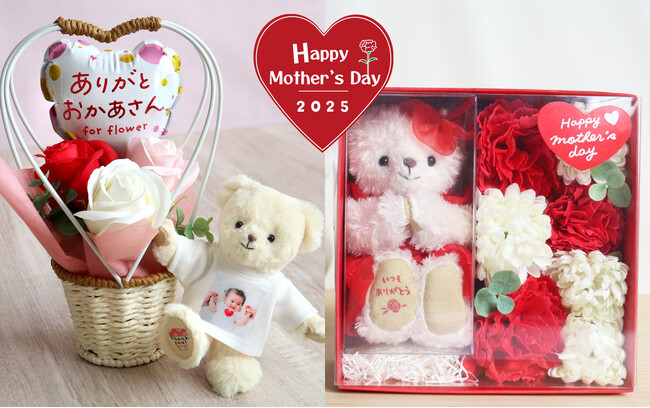 母の日にテディベアフラワーギフトを贈りませんか?名入れプリントもできるので、世界にひとつだけのギフトに。