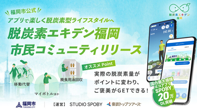 脱炭素社会の実現に向けて、株式会社スタジオスポビー(東京都中央区、代表取締役:夏目恭行、以下「当社」)は、2025年3月より、福岡市民及び企業従業員一人ひとりの脱炭素型ライフスタイルへの移行を促進する「脱炭素エキデン福岡」を開始します。AI技術を搭載させた脱炭素アプリ「SPOBY」で、行政と企業が一丸となり個人脱炭素を推進します。