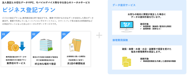 「ビジネス登記プラン」は、登記できるサービスに加えて、お持ちのスマートフォンやノートパソコンなどのデータ紛失時の復旧と修理費用保険がセットになったサービスです。