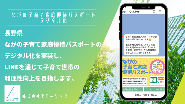この度、株式会社アローリンク(本社:兵庫県神戸市中央区雲井通4-2-2 マークラー神戸ビル4階、代表取締役:蓬莱和真)は、長野県(知事:阿部 守一)が拡張ツール「Liny」を活用し、長野県LINE公式アカウントにて県内の子育て世帯向けの「ながの子育て家庭優待パスポート」を新たに導入し、運用を開始しました。