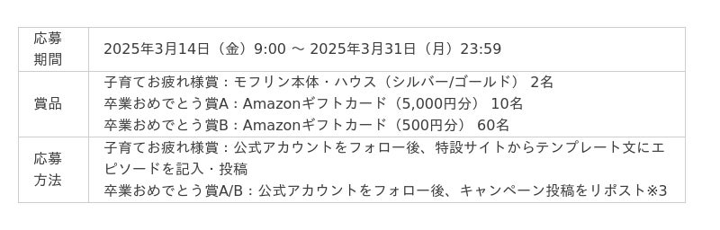 ※3:両賞への応募可。子育てお疲れ様賞は後日抽選、卒業おめでとう賞A/Bは当日中に当選通知。