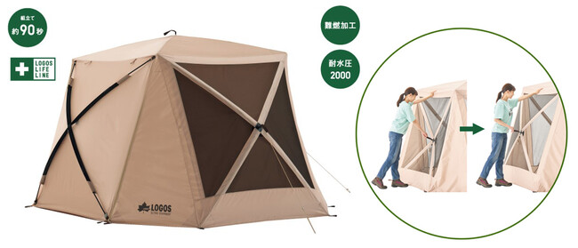 テントの生地には、米国の難燃基準「CPAI-84」に適合した燃えにくい生地を採用し、万が一火の粉が付着しても、燃え広がらずすぐに鎮火する。また、UV-CUT加工を施し、紫外線を約90%以上カットするほか、急な天候の変化にも安心の、防水・撥水機能を搭載。縫い目の隙間にシームテープ加工を施すことでさらに高い防水性を実現。