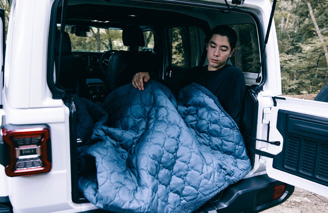 「バンライフ(車中泊)を寒さに邪魔させない」というコンセプトから生まれたアウトドアブランケット。自分の身体から発する熱で温めて、魔法瓶のような構造で冷気を防いで熱をためる独自構造。